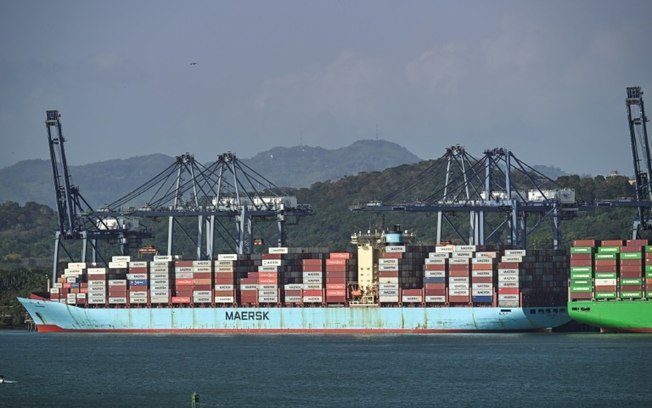 Um navio de carga espera no porto de Balboa antes de cruzar o Canal do Panamá, na Cidade do Panamá,