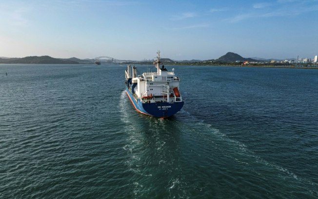 Vista aérea de um navio de carga que entra no canal do Panamá, na costa do oceano Pacífico, na Cidade