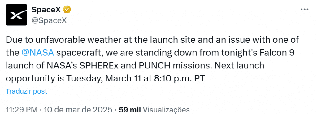 Na madrugada desta terça-feira (11), a NASA enviaria, ao Espaço, duas missões no mesmo foguete da SpaceX, o Falcon 9.