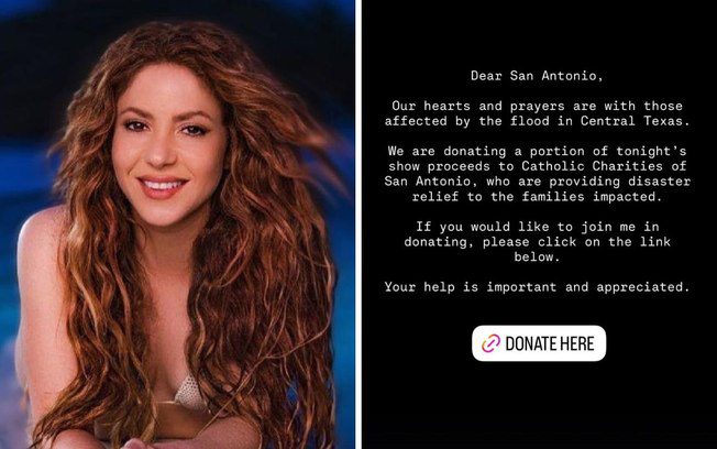 Shakira doa parte de show às vítimas das enchentes no TexasReprodução/Instagram A cantora Shakira doou parte da arrecadação do show em San