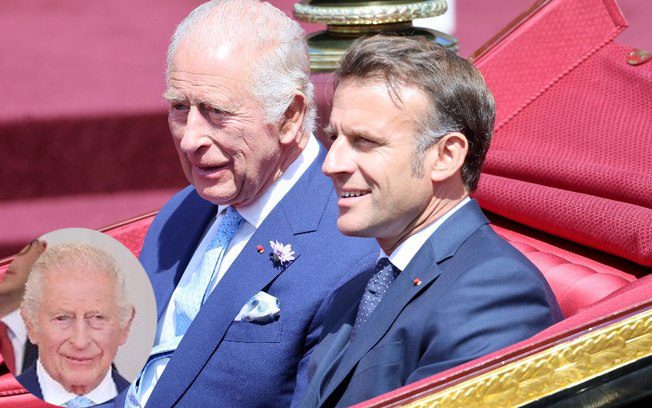 O rei Charles foi visto com um olho vermelho ao receber o presidente francês Emmanuel Macron e Brigitte Macron no
