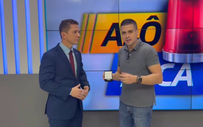 O delegado André Viana e o apresentador Marcelo Castro no Alô Juca, da TV AratuReprodução: TV Aratu O apresentador Marcelo
