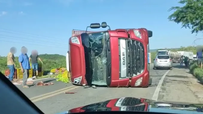 Uma carreta tombou na BR-135, no trecho entre os povoados de Caraíbas e Malhadinha, no Oeste da Bahia, na manhã