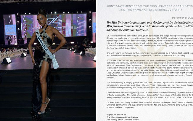 Miss Jamaica sofre hemorragia intracraniana após queda em desfileInstagram/@officialmissuniversejamaica A Organização Miss Universo (MUO) divulgou nesta segunda-feira (8) novos detalhes