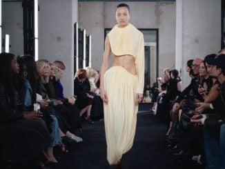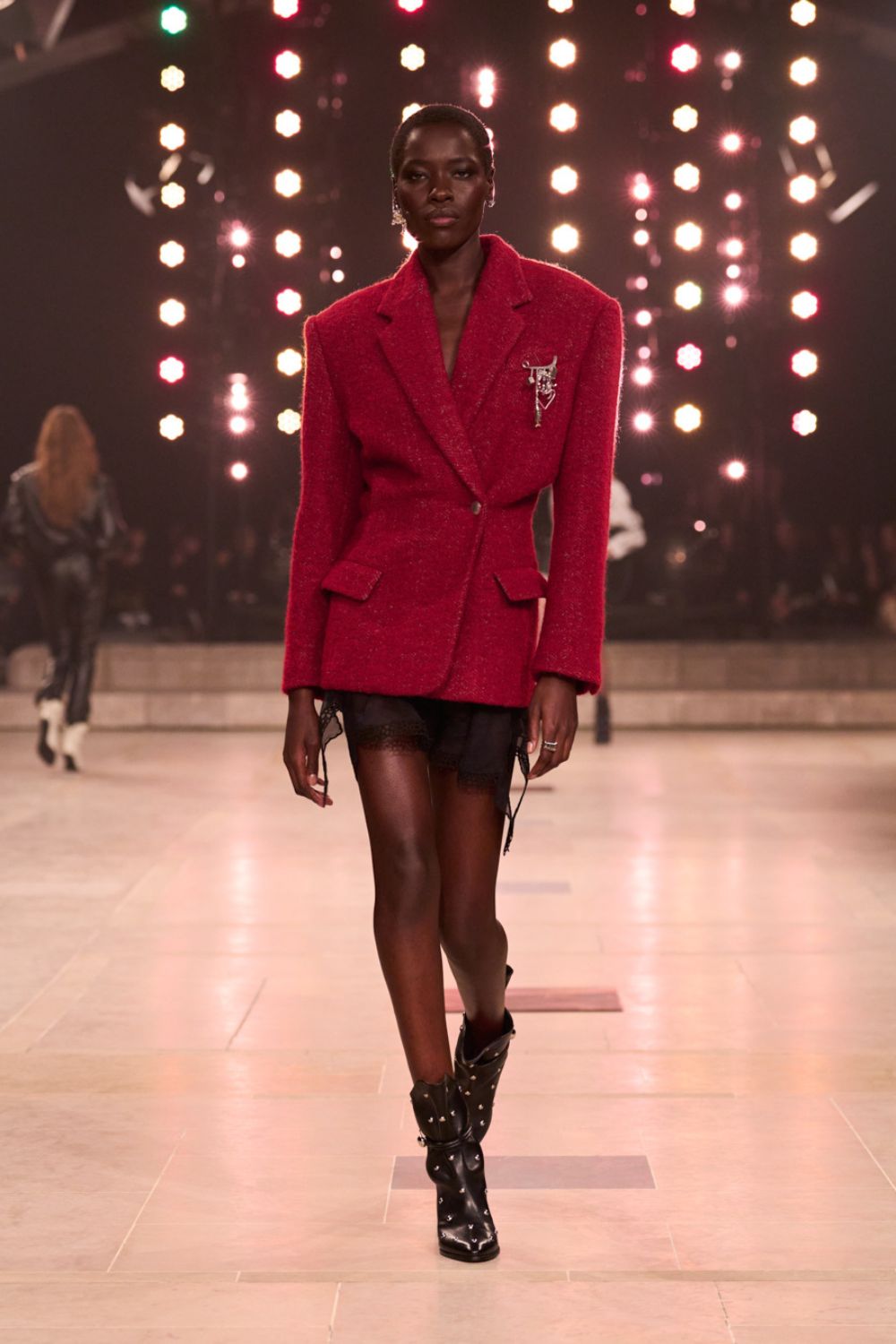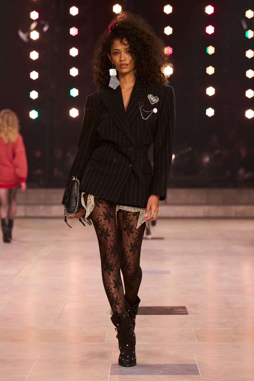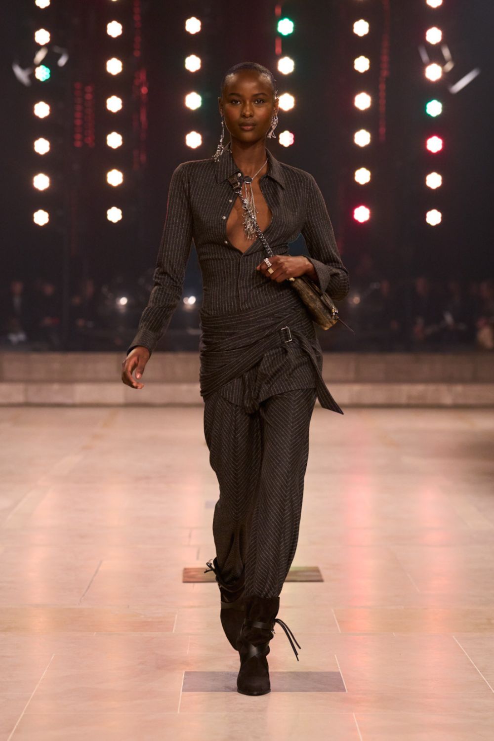 Um match perfeito: o hit de Marie Davidson remixado por Soulwax flerta com a ideia de trabalho, assim como as peças com a padronagem risca de giz que Marant apresentou na nova coleção. Em uma temporada na qual já se fala em “Corp Core” como possível tendência, a interpretação da estilista para o estilo passa longe da sobriedade que se espera de um escritório (e que francesa olharia para o trabalho de maneira tão rígida?). Quer um exemplo? Olhe para o blazer risca-de-giz, usado como minivestido, pronto para o momento off-duty