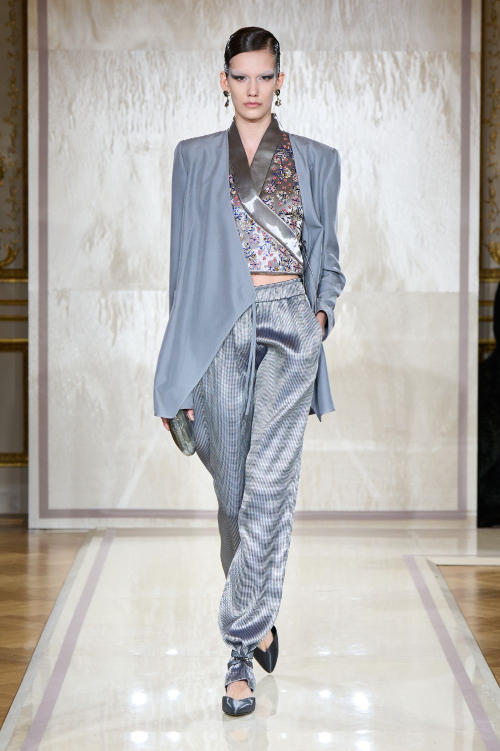 Mais de 90 looks de Alta Costura passaram pela passarela da Armani Privé, que comemorou com esta apresentação os 20 anos de marca, pilotada pelo incansável Giorgio Armani. Aos 90 anos de idade, ele fez questão de entrar e andar por entre as salas do desfile para receber os aplausos da plateia, de mãos dadas com a noiva da temporada – o tradicional último look dos desfiles de couture. E que noiva! Era a modelo brasileira Katia André, que revelou ter ficado extremamente emocionada, a ponto de se segurar para não chorar. Emoção foi, certamente, um componente importante deste show. E ele merece, né? Construiu um império, imprimiu um estilo próprio, honra o made in Italy  temporada após temporada.