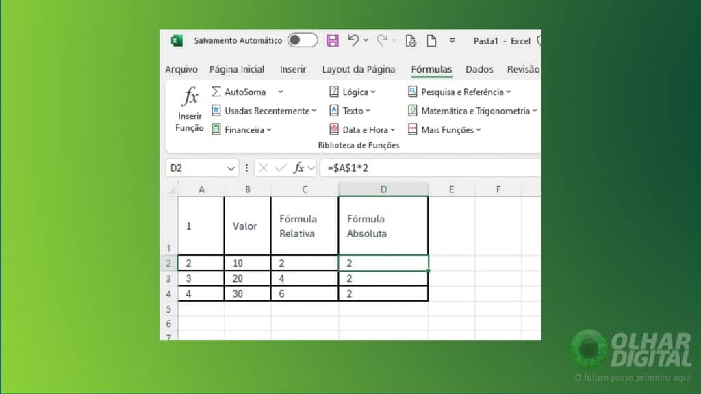 =SOMAR(A1:A10)muda para=SOMAR(B1:B10)se copiada para outra coluna. - Referências Absolutas: Mantêm a mesma referência independentemente de onde são copiadas. Exemplo:
