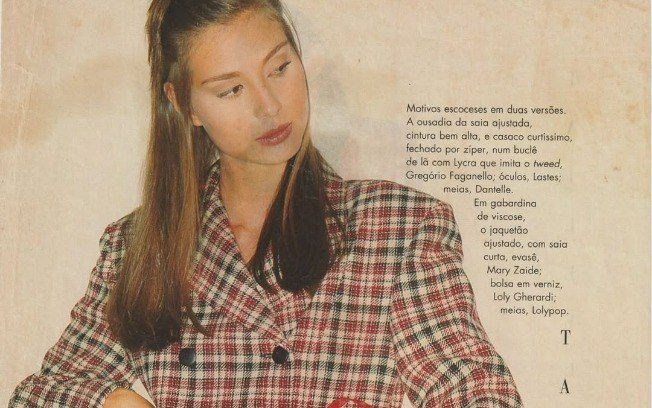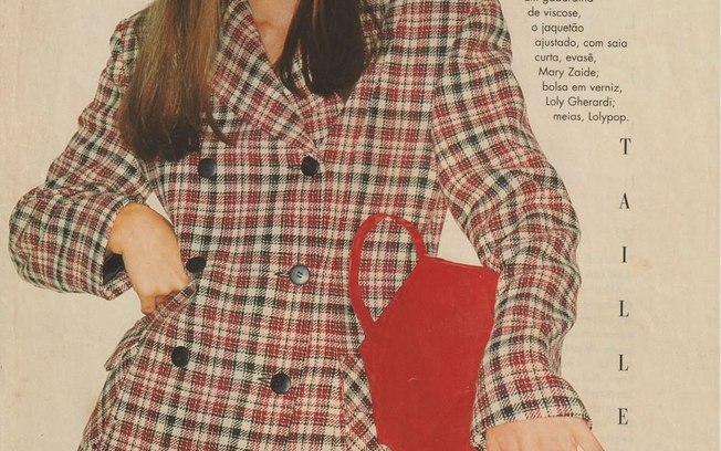 Na sequência de fotos, publicadas na última sexta-feira (28), a atriz posou com um conjunto de paletó e saia quadriculados com uma bolsa vermelha. Em um outro clique, Lavínia usa um vestido roxo e meia calça preta, roupas que faziam parte da moda da época.