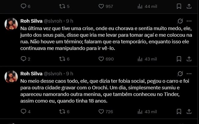 Segundo Roh Silva, o relacionamento teve início quando ela tinha 18 anos e evoluiu para uma convivência marcada por desgaste emocional. “Morávamos juntos. Acabou com meu psicológico”, escreveu. A designer também afirmou que, à época, ainda não havia sido diagnosticada com Transtorno do Espectro Autista nível 2, o que, segundo ela, agravou a situação.