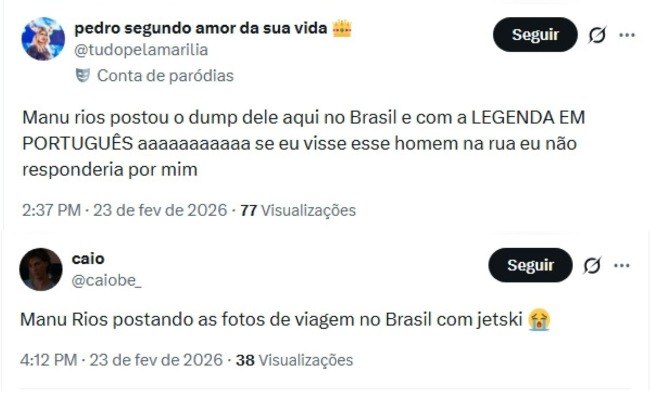 Comentários no X (antigo Twitter) sobre a passagem de Manu Ríos no BrasilReprodução/X