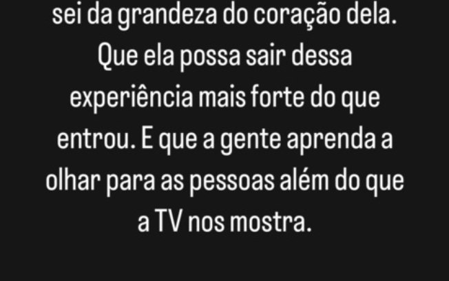 Ao final do texto, Belo teceu mais elogios à participante: “Nada do que vivemos juntos será apagado, e eu sei da grandeza do coração dela. Que ela possa sair dessa experiência mais forte do que entrou. E que a gente aprenda a olhar as pessoas além do que a TV nos mostra”.