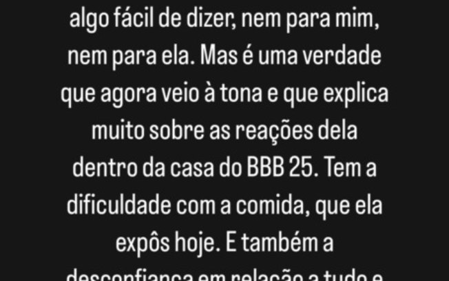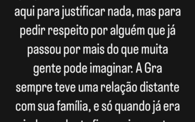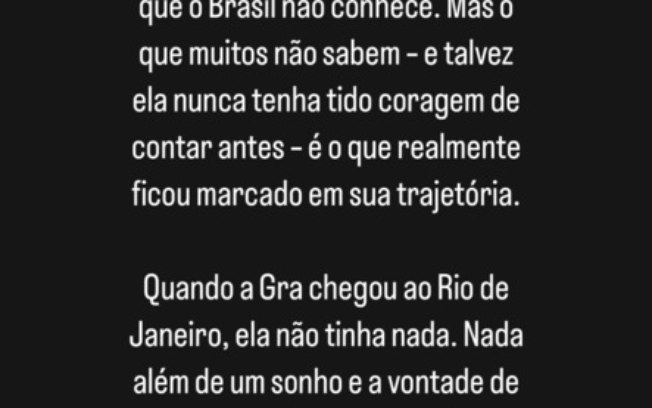 Ele, então, mencionou o que foi dito pela sister no programa: em momentos de vulnerabilidade, Gracy chegou a se alimentar com comidas encontradas no lixo. “Quando a Gra chegou ao Rio de Janeiro, ela não tinha nada. Nada além de um sonho e a vontade de vencer. Teve dias em que não teve o que comer, noites em que não tinha onde dormir. Ela passou dificuldades. Fome. Parte disso ela já tinha conseguido contar publicamente, parte não”, recordou.