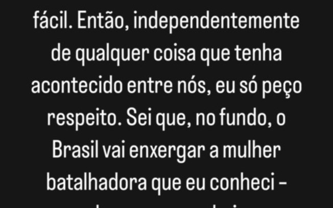 No relato, o pagodeiro reconheceu a força da ex-mulher e pediu compreensão ao que foi dito por ela. “O medo de passar por tudo aquilo de novo deixa marcas que ninguém vê, mas que influenciam até as pequenas escolhas. Eu não estou aqui para justificar nada, mas para pedir respeito por alguém que já passou por mais do que muita gente pode imaginar”, ressaltou ele.