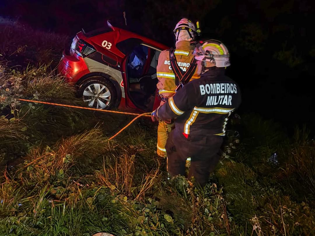 Ao chegarem ao local, os bombeiros encontraram um veículo modelo Polo em uma área de terreno inclinado. Após avaliação da cena, a equipe realizou a estabilização do automóvel com o uso de cordas, garantindo a segurança da operação. Em seguida, foi feita a ancoragem dos militares, possibilitando o início do trabalho de desencarceramento com segurança operacional.