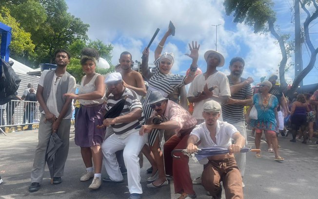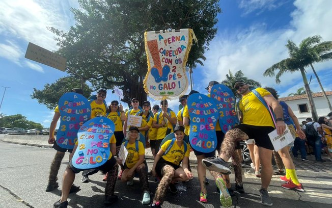 Outro grupo que chamou a atenção foi o “Dois pés no Galo”. Formada por cerca de 20 pessoas, a fantasia faz referência ao cinema pernambucano, inspirada em obra de Kleber Mendonça Filho, mistura elementos da cultura popular, como a camisa da Pitombeira dos Quatro Cantos e a figura da Perna Cabeluda.