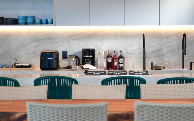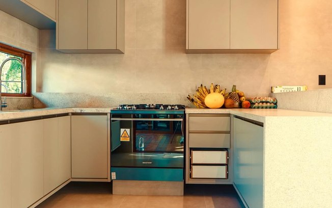 Os ambientes internos seguem uma proposta de integração e amplitude. A residência possui cozinha completa, preparada para longas estadias e eventos privados, além de uma sala ampla que conecta os espaços e favorece a convivência.