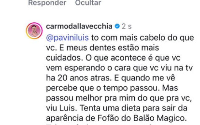 “Mas passou melhor para mim do que para você, viu? Tenta uma dieta para sair da aparência de Fofão do Balão Mágico. Talvez ajude você a pegar mais gente”, rebateu o intérprete de 54 anos.