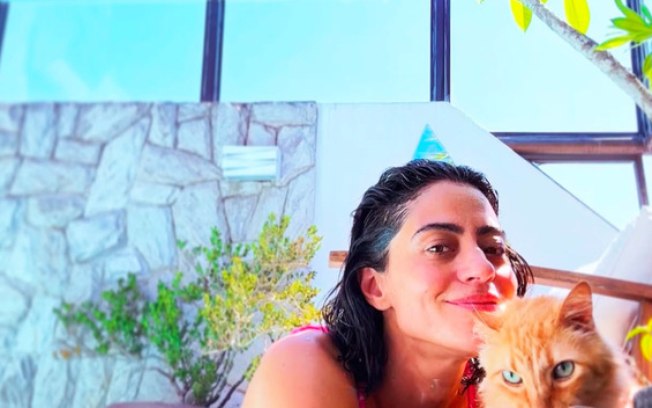 Em uma das fotos compartilhadas pela atriz, ela aparece ao lado de seu gatinho. Para o momento, a intérprete apostou em um biquíni rosa. Nos comentários, os internautas a encheram de elogios.