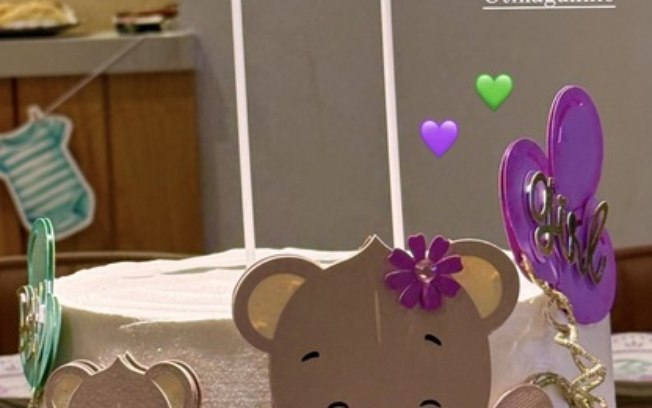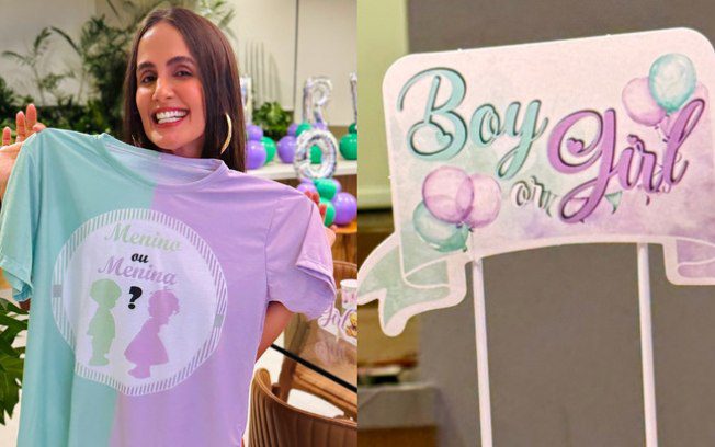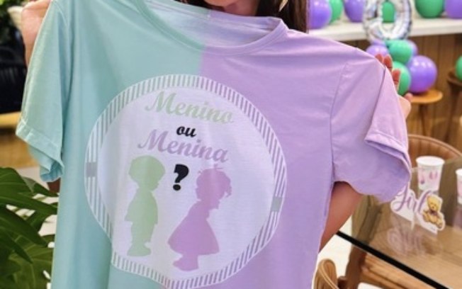 Com uma decoração apoiada nas cores verde e roxa, que representam o gênero do bebê, os dois tiveram um momento dedicado à gravidez. Em um dos cliques, a ex-BBB aparece segurando uma blusa escrito “Menino ou menina?”.