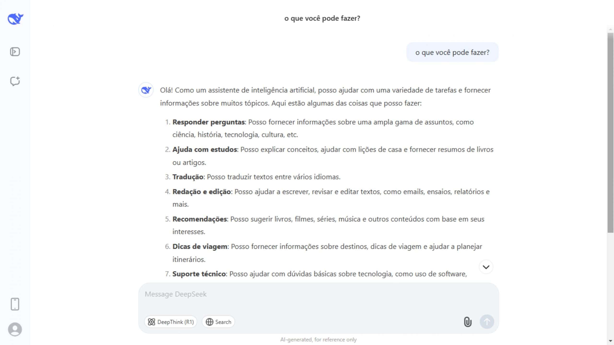 Esse chatbot permite interações naturais, como a geração de textos, esclarecimento de dúvidas e auxílio em programação, entre outras funções. Com uma interface intuitiva e recursos versáteis, o DeepSeek se apresenta como uma alternativa interessante para quem busca soluções em IA.