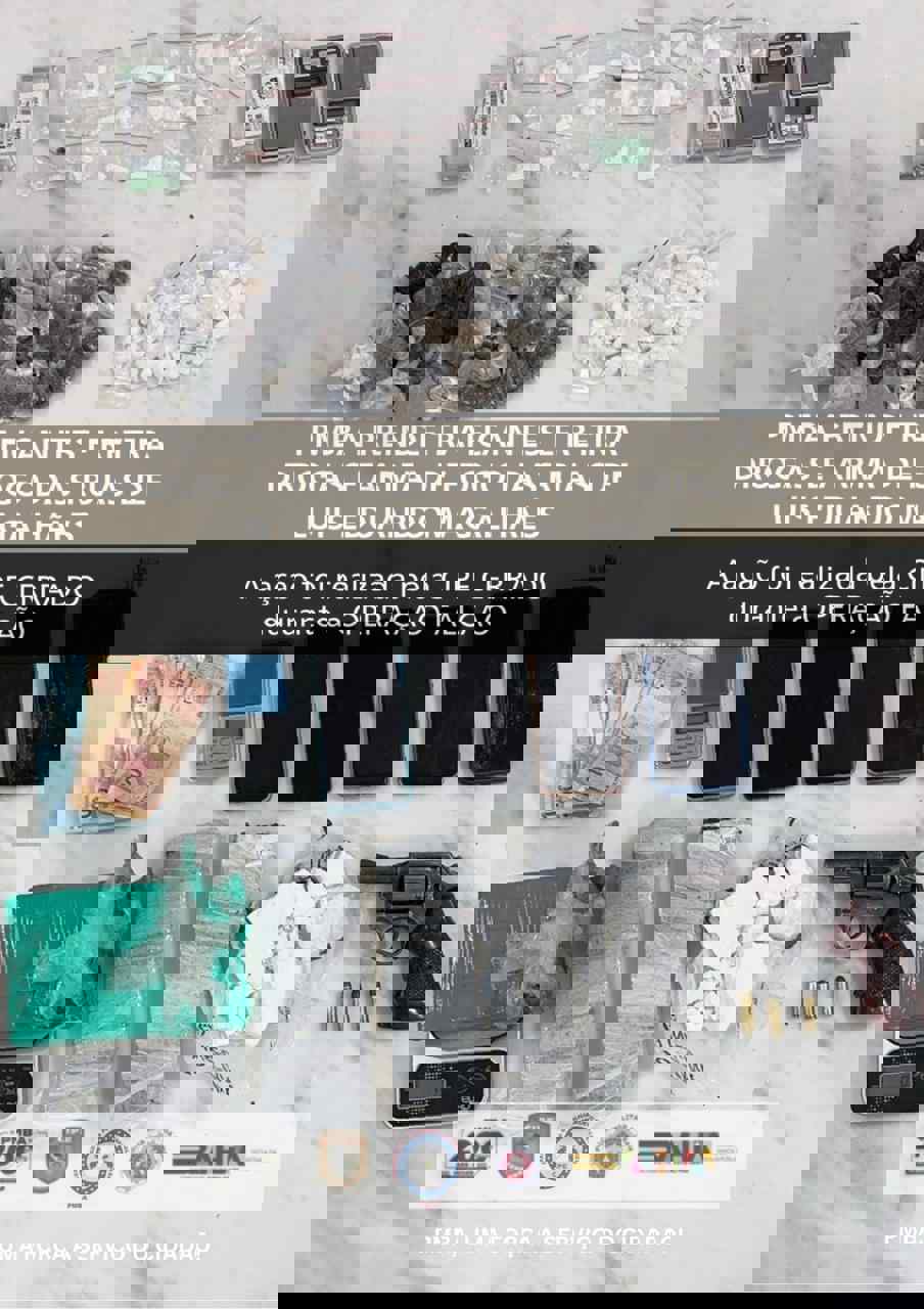 Com o abordado foram encontradas porções fracionadas de maconha e cocaína. Na sequência, ainda seguindo as informações repassadas, a equipe policial realizou abordagem ao VW Gol vermelho, com rodas grandes de liga-leve, que estaria realizando a distribuição da droga, encontrando mais maconha, cocaína e um revólver. Por fim, ao passar pela rua Cafarnaum, a guarnição percebeu um terceiro indivíduo, integrante do grupo criminoso, em fuga, saindo de uma residência com uma mochila. O homem foi abordado e com ele havia mais maconha e cocaína, além de materiais inerentes ao tráfico.