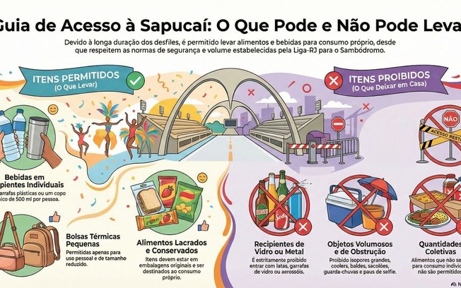 Também é importante ficar atento ao que pode ou não levar para a Sapucaí. São muitas agremiações e longas horas de desfile. Então,já virou tradição carnavalesca levar lanches, alimentos e bebidas. De acordo com a Liga -RJ os espectadores podem entrar com até 2 garrafas plásticas e ou um copo térmico de 500 ml, alimentos lacrados e devidamente conservados, pequenas bolsas térmicas de uso pessoal.