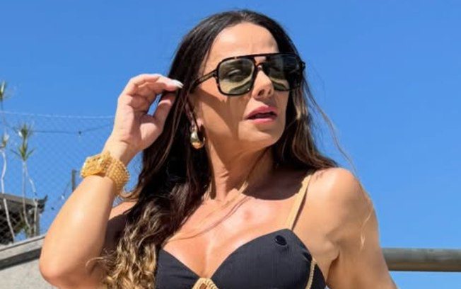 Viviane Araujo, de 50 anos, usou as redes sociais nesta segunda-feira (12) para compartilhar um álbum de fotos com os fãs. Nos cliques, a rainha de bateria do Salgueiro alivia o calorão usando um biquíni e mostrava as tatuagens.
