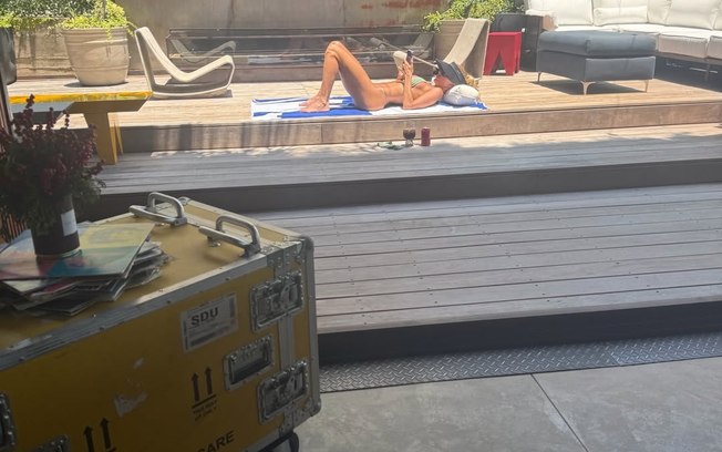 Momentos de descontração à beira da piscina também marcaram os registros publicados pela artista, que elegeu biquínis nas cores verde e marrom para manter o bronze em dia.