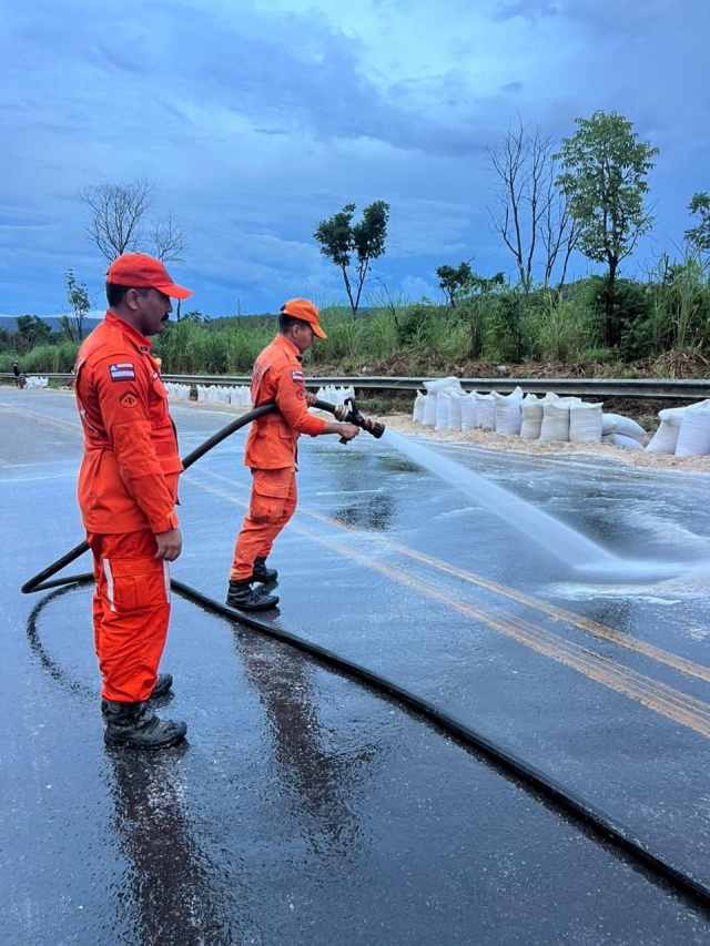 Na tarde de segunda-feira (23), por volta das 14h30, equipes do 17º Batalhão de Bombeiros Militar (17º BBM) foram acionadas para atender a uma ocorrência de derramamento de carga sobre a BR-242, próximo à Cargill, em Barreiras, oeste da Bahia.