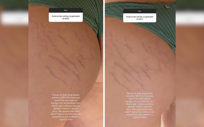 “Nossa, no final da gestação estourou muita estria em mim! Não tive nada na barriga, tive no bumbum só e depois que a Aurora nasceu, quando comecei a perder peso, elas apareceram bem mais! Agora vou começar uns tratamentos pra melhorar o aspecto delas”, contou.