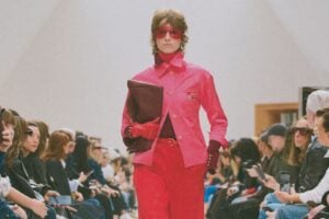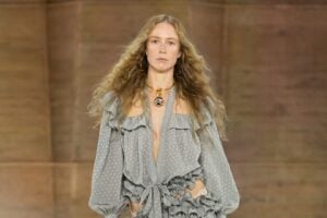DRAPEADOS E PREGAS ATRAVESSARAM A COLEÇÃO, mas o diretor criativo evita as referências literais. Há desde vestidos etéreos, cobertos por capas esvoaçantes até saias-lápis de shape rigoroso e blusas acetinadas de construção precisa. O detalhe recorrente são as faixas de cetim marcando a cintura, um gesto que atravessa diferentes looks e chega inclusive à alfaiataria masculina, criando um fio condutor fashion.