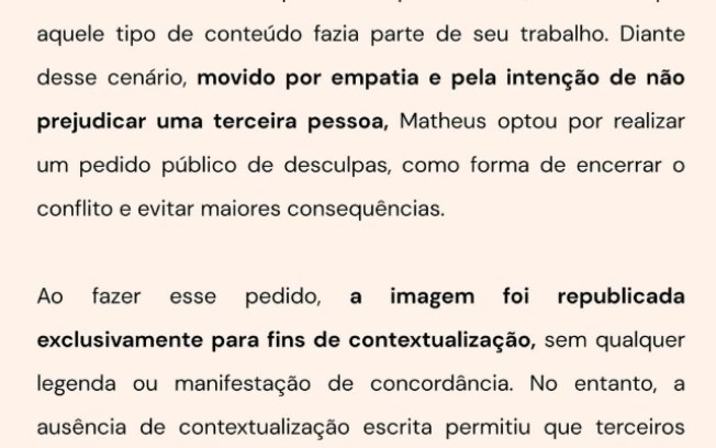 Equipe de Matheus se pronuncia após notificação por imagem de IA