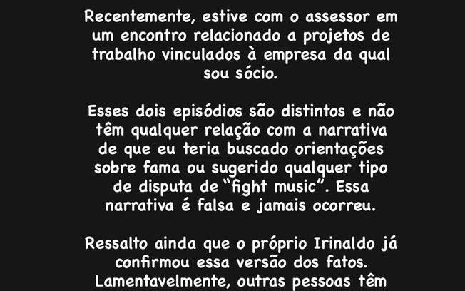 Segundo ele, os dois episódios não têm ligação, e não corroboram com as acusações de que ele teria buscado o assessor para receber “orientações sobre fama ou sugerido qualquer tipo de disputa ou Fight Music”. “Essa narrativa é falsa e jamais ocorreu”, disse Thiago, referindo-se a boatos de que ele havia proposto uma luta com Lucas Souza.