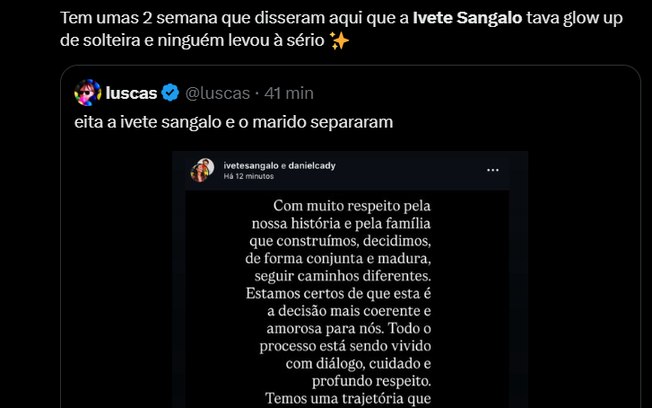 Após os fãs e Marcelo Sangalo reagirem ao comunicado de separação de Ivete Sangalo e Daniel Cady, várias celebridades da classe artística prestaram apoio ao ex-casal nas redes sociais.