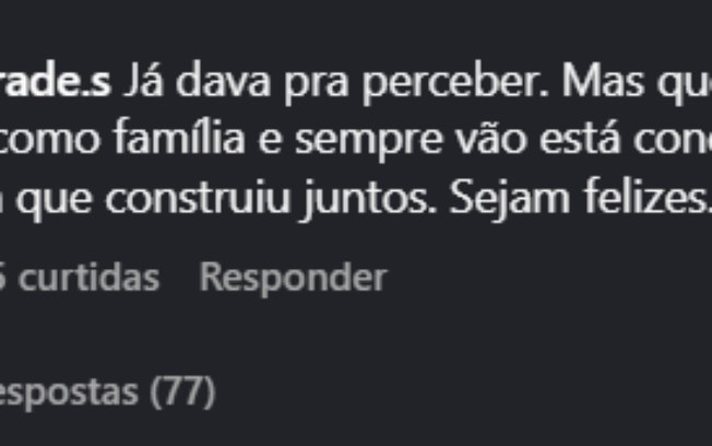 Outros seguidores demonstraram tristeza pela ruptura e desejaram força ao ex-casal. Comentários emocionados diziam: “Um casal que é referência de amor e construção de uma linda história, nos entristece em saber”, além de recados de apoio: “Não é fácil passar pela separação dos pais, mas a gente supera. Resiliência e felicidades, mainha”.