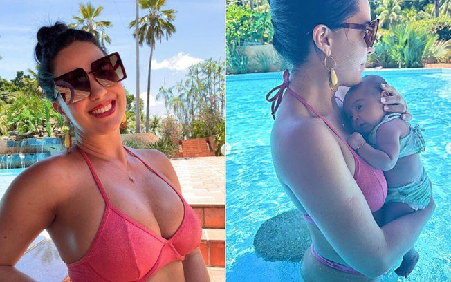 A influenciadora compartilhou fotos em que aparece de biquíni, mostrando o corpo no pós-parto, e celebrou a primeira experiência da bebê na piscina.
