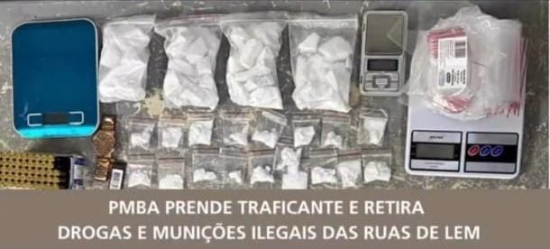 No local indicado, os policiais identificaram o suspeito e durante a abordagem localizaram expressiva quantidade de cocaína, munições de calibre 9mm e dinheiro em espécie.