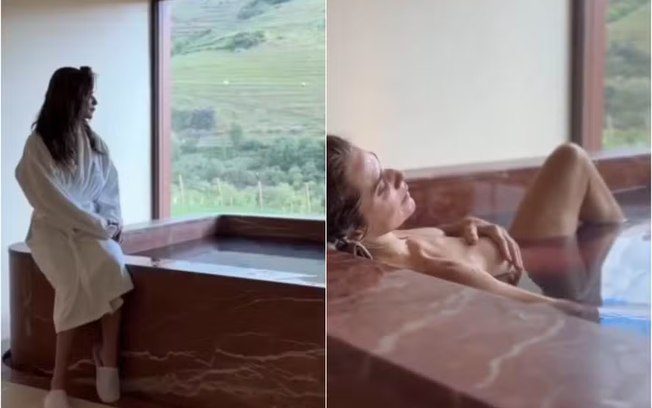 No vídeo publicado pela atriz no Instagram, Leticia relaxa em uma banheira com vista para a natureza e exibe parte do ritual de bem-estar feito no spa português.
