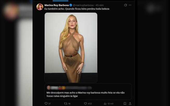 Ao ver a publicação, Marina optou por uma resposta bem-humorada. A atriz ironizou o ataque e retomou uma antiga mudança de visual. “Eu também acho. Quando ficou loira perdeu toda beleza”, publicou a conta oficial da artista, junto de uma foto em que aparece com os cabelos loiros.