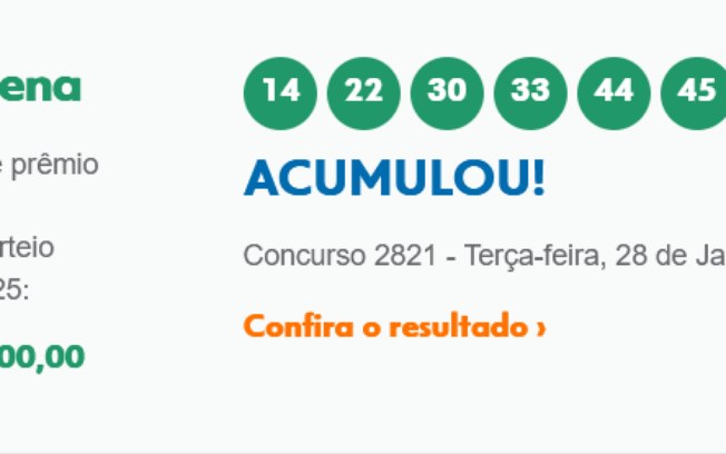 A Caixa Econômica Federal sorteou nesta terça-feira (28) a Mega-Sena, e não houve nenhum vencedor. O sorteio aconteceu às 20h, no Espaço da Sorte, em São Paulo, e oprêmio acumulou para R$ 6 milhões.