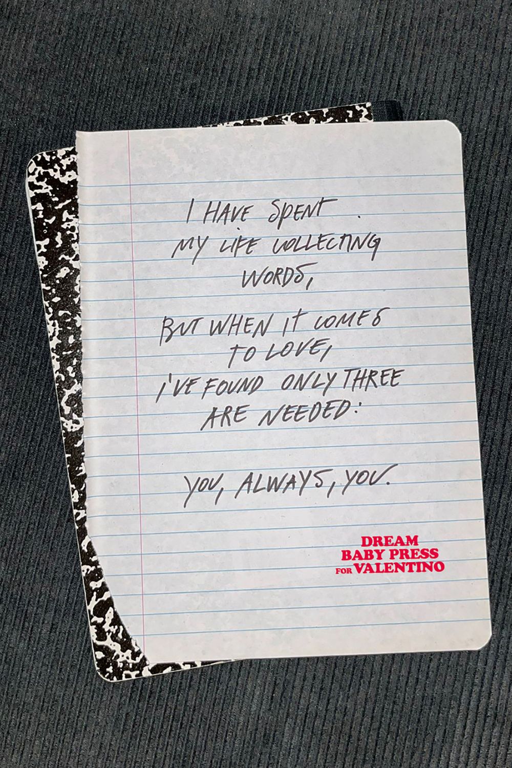 Atenção: as definições para “correio elegante” acabam de ser atualizadas. Para este Dia dos Namorados, comemorado no dia 14 de fevereiro no Hemisfério Norte, a Valentino se uniu à editora nova-iorquina Dream Baby Press e criou edições impressas de cartas de amor escritas por seis diferentes autores contemporâneos.