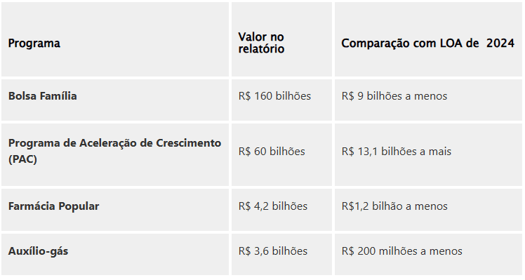 O projeto aprovado também apresenta ajustes em alguns programas sociais, como o Bolsa Família, que sofreu um corte de quase R$ 9 bilhões, apesar de ter continuado com um valor total de R$ 160 bilhões. Também foram resolvidas pendências em torno dos programas Pé-de-Meia e Vale-Gás.