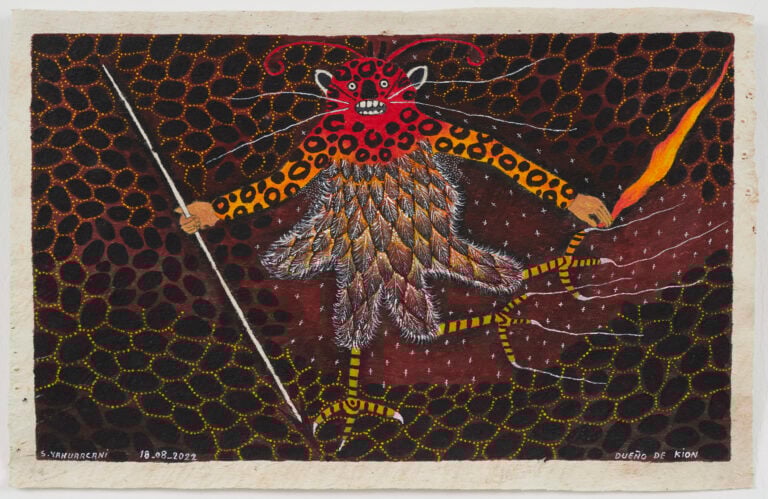 A produção de Yahuarcani articula esses saberes ancestrais com episódios de violência na Amazônia, como o ciclo da borracha. Neto de um sobrevivente do genocídio de Putumayo, o artista usa a pintura como forma de preservar memória e tensionar a história, em trabalhos que combinam narrativa simbólica e dimensão política.