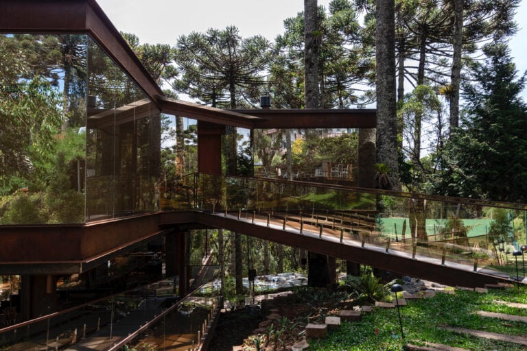 Assinado por Aref Farkouh, o projeto levou cerca de um ano e adota uma lógica construtiva precisa, com estruturas metálicas elevadas sobre tubulões de concreto, evitando movimentações agressivas de solo. Materiais como aço corten e vidros de alta performance reforçam durabilidade e eficiência, enquanto a implantação preserva a vegetação existente, em um dos chalés, uma araucária atravessa o ambiente, incorporada à arquitetura.