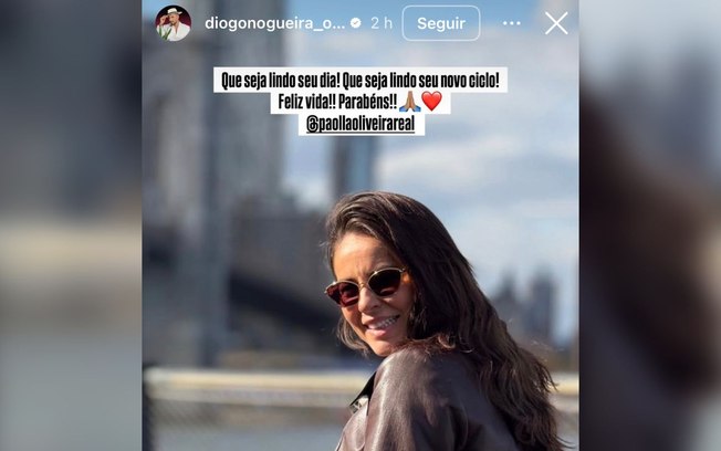 O cantor Diogo Nogueira usou as redes sociais nesta terça-feira, 14, para homenagear a ex-namorada, a atriz Paolla Oliveira, que completa 44 anos. Em um story publicado no Instagram, o sambista compartilhou uma foto da artista sorridente e deixou uma mensagem carinhosa. “Que seja lindo seu dia! Que seja lindo seu novo ciclo! Feliz vida!! Parabéns!!”, escreveu, acompanhado de um emoji de coração.