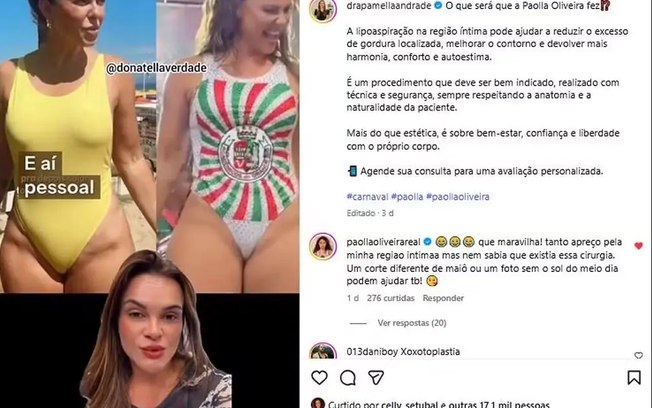 Paolla Oliveira reagiu após ter o nome envolvido em um vídeo com especulações sobre ter realizado uma suposta cirurgia íntima. Na gravação, publicada no Instagram, uma cirurgiã plástica comparou imagens da atriz usando maiô e sugeriu uma possível mudança do “Monte de Venus”, região localizada acima da vagina.