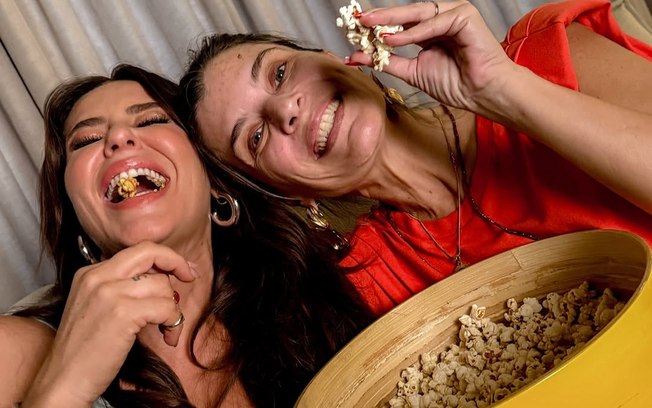 O post destaca momentos de uma rotina de ensaio fotográfico e gravação, com preparação, dança e até uma pausa para a pipoca. Em um registro, Paolla aparece ao lado de Kelner Macedo, ator de Tremembé.