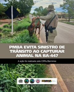 Durante patrulhamento na BA-447, próximo ao Aras Porto, município de Barreiras, o TOR da CIPRv/Barreiras localizou um cavalo invadindo parte da rodovia, fato que oferecia risco aos usuários da via.