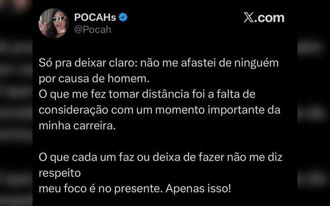 Após especulações sobre um possível afastamento entre as cantoras Pocah e Rebecca, a ex-BBB decidiu se pronunciar publicamente para esclarecer a situação. Em publicação feita no X (antigo Twitter), Pocah negou que o distanciamento tenha sido motivado por questões pessoais envolvendo terceiros e apontou outro motivo para a ruptura.