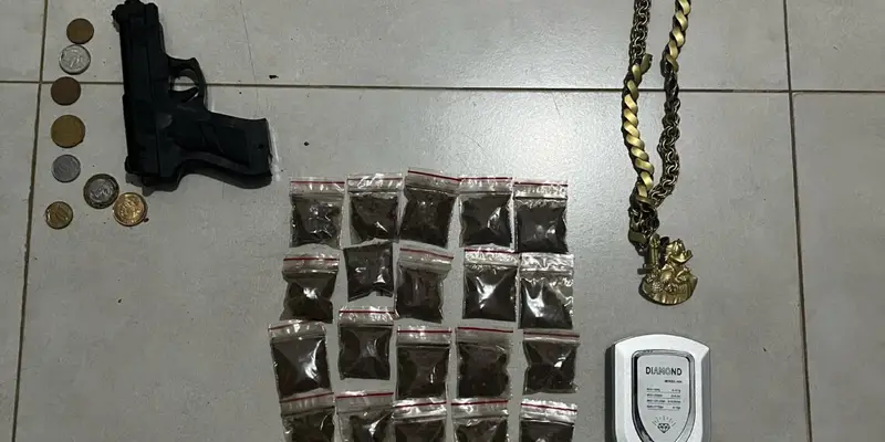 Os policiais flagraram os jovens fumando cigarros com odor característico de maconha e realizaram a abordagem. Na busca pessoal, foram encontrados uma faca na cintura de Leonardo Nunes de Araújo e um simulacro de arma de fogo com Isaac da Silva Cerqueira. Próximo a eles, os agentes localizaram uma sacola contendo substância semelhante à maconha, além de materiais usados na comercialização de drogas.
